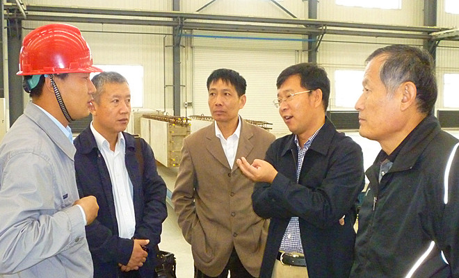 上圖為徐鵬強董事長(右二)在沈陽工業(yè)化部品生產(chǎn)車間與車間負責(zé)人交流