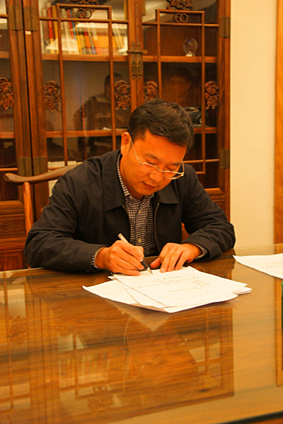 上圖為昌大建設(shè)集團董事長徐鵬強在簽署成立文件