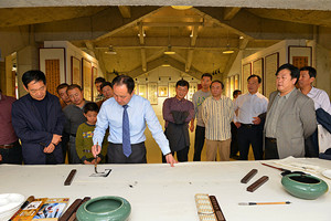 開幕式之后,與會領(lǐng)導(dǎo)、嘉賓和會員參觀了設(shè)在“昌大美術(shù)館“的劉良峰個(gè)展作品,書法家們還現(xiàn)場潑墨題字獻(xiàn)寶。另外,上午活動之余,與會人員還參觀了“泰和上筑”樓盤。