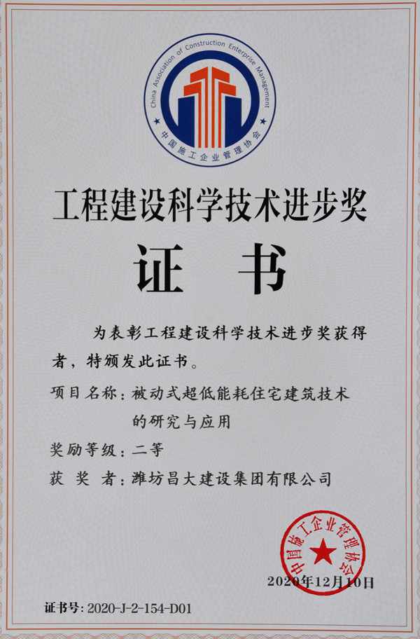 2020年12月11日,中國施工企業(yè)管理協(xié)會(huì)在北京召開“2020年工程建設(shè)科學(xué)技術(shù)獎(jiǎng)勵(lì)大會(huì)”,表彰了工程建設(shè)最高科學(xué)技術(shù)獎(jiǎng)1項(xiàng),工程建設(shè)技術(shù)發(fā)明獎(jiǎng)10項(xiàng),工程建設(shè)科學(xué)技術(shù)進(jìn)步獎(jiǎng)343項(xiàng)。其中,集團(tuán)二建公司工程公司《被動(dòng)式超低能耗建筑住宅技術(shù)的研究與應(yīng)用》,經(jīng)過形式審查、專家網(wǎng)絡(luò)評審、專家委員會(huì)會(huì)議評審、科學(xué)技術(shù)委員會(huì)審定四個(gè)階段(本年度評審?fù)ㄟ^率只有40%),最終榮獲工程建設(shè)科學(xué)技術(shù)進(jìn)步獎(jiǎng)二等獎(jiǎng)。![]() |
