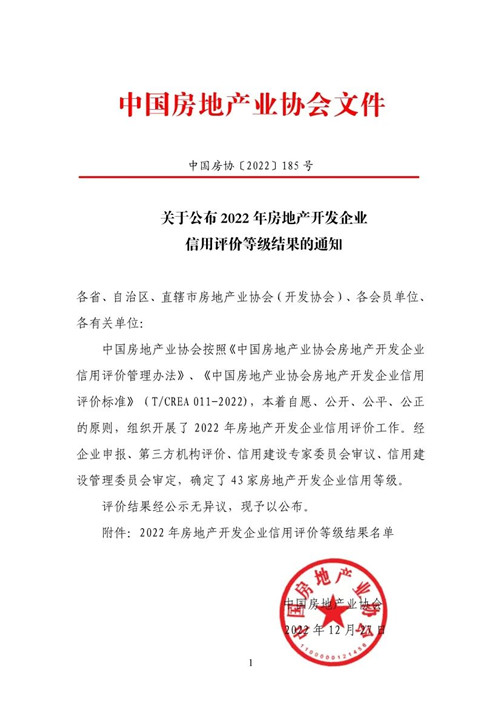 2022年12月27日,中國房地產(chǎn)業(yè)協(xié)會公布了2022年全國房地產(chǎn)開發(fā)企業(yè)信用評價等級結(jié)果,全國43家房地產(chǎn)開發(fā)企業(yè)經(jīng)嚴(yán)格、公正評審后獲評信用等級。集團(tuán)泰和置業(yè)榮獲此次信用評價的最高等級——AAA級,這也是泰和置業(yè)繼2016年、2019年獲評AAA級后,再次獲得國家權(quán)威機(jī)構(gòu)的肯定。作為衡量一家企業(yè)綜合實力的重要指標(biāo),企業(yè)AAA信用評級具有極高“含金量”。依據(jù)對評估對象的信用紀(jì)錄、履約能力、經(jīng)營狀況以及專家實地核驗等多項指標(biāo)的科學(xué)評估與認(rèn)證,企業(yè)信用等級越高,代表其經(jīng)營狀況、履約行為、信用紀(jì)錄越良好,是對企業(yè)信譽(yù)建設(shè)的高度認(rèn)可。企業(yè)信用評級證書有效期3年,中房協(xié)委托評價機(jī)構(gòu)對有效期內(nèi)企業(yè)每年進(jìn)行信用動態(tài)監(jiān)測。 信用是企業(yè)寶貴的無形資產(chǎn),也是企業(yè)的誠信名片和市場通行證。泰和置業(yè)多次獲評最高信用等級,充分體現(xiàn)了泰和置業(yè)在誠信經(jīng)營方面的重視與堅守,以“品質(zhì)”為基石,嚴(yán)格把控產(chǎn)品規(guī)劃設(shè)計、建設(shè)、銷售和服務(wù)的各個環(huán)節(jié),精于勤,作于細(xì),方寸之間,匠心盡顯。同時也說明,集團(tuán)各參建單位在統(tǒng)一協(xié)調(diào)配合等方面出色和卓越的工作。