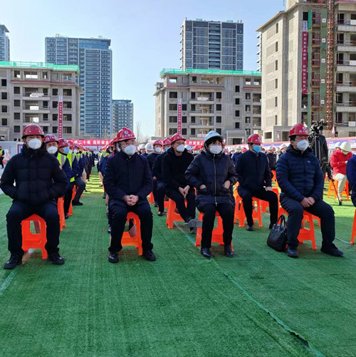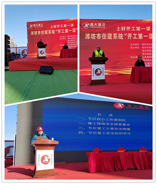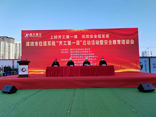 2023年2月15日上午,濰坊市住建系統(tǒng)“開工第一課”啟動活動暨安全教育培訓會議在集團八建公司高創(chuàng)·水緣灣項目現(xiàn)場舉行。濰坊市住建局黨組書記、局長鐘光文,濰坊市建筑業(yè)發(fā)展服務中心主任許增賢,高新區(qū)住建局局長牟軍生等出席活動。集團公司總裁朱九洲,副總裁楊成國出席并全程參與活動。各縣市區(qū)住建局主要負責人、分管負責人,相關(guān)業(yè)務科室負責人;房地產(chǎn)開發(fā)企業(yè)、建筑施工企業(yè)、 監(jiān)理企業(yè)分管安全負責人,集團安全生產(chǎn)部、各基層公司安全總監(jiān)、安全生產(chǎn)部全體人員共約200余人參會。