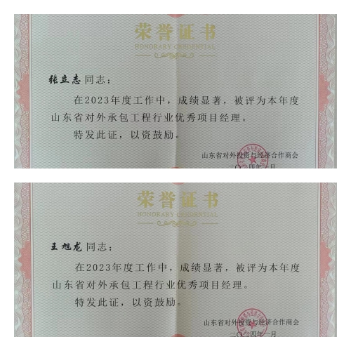 2024年3月12-13日,山東省對外投資與經(jīng)濟(jì)合作商會舉行行業(yè)發(fā)展交流大會,并對2023年度商會先進(jìn)單位和個(gè)人進(jìn)行表彰,集團(tuán)獲“二〇二三年度山東省對外承包工程行業(yè)先進(jìn)單位”榮譽(yù)稱號,海外公司張立志、王旭龍獲“山東省對外承包工程行業(yè)優(yōu)秀項(xiàng)目經(jīng)理”榮譽(yù)稱號。