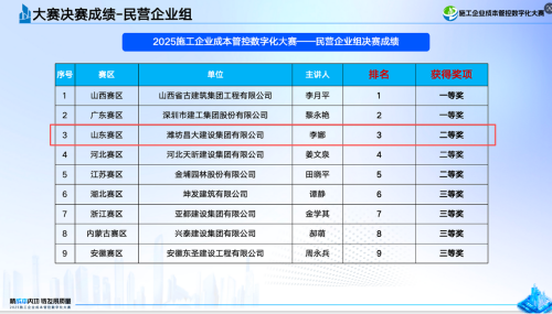 近日,備受建筑行業(yè)關注的“2025施工企業(yè)成本管控數字化大賽總決賽暨頒獎典禮”在北京圓滿落幕。集團公司憑借扎實的成本數字化實踐成果,從全國近三千家參賽企業(yè)中脫穎而出,最終斬獲民營企業(yè)整體排名第三、民營企業(yè)組二等獎的優(yōu)異成績。